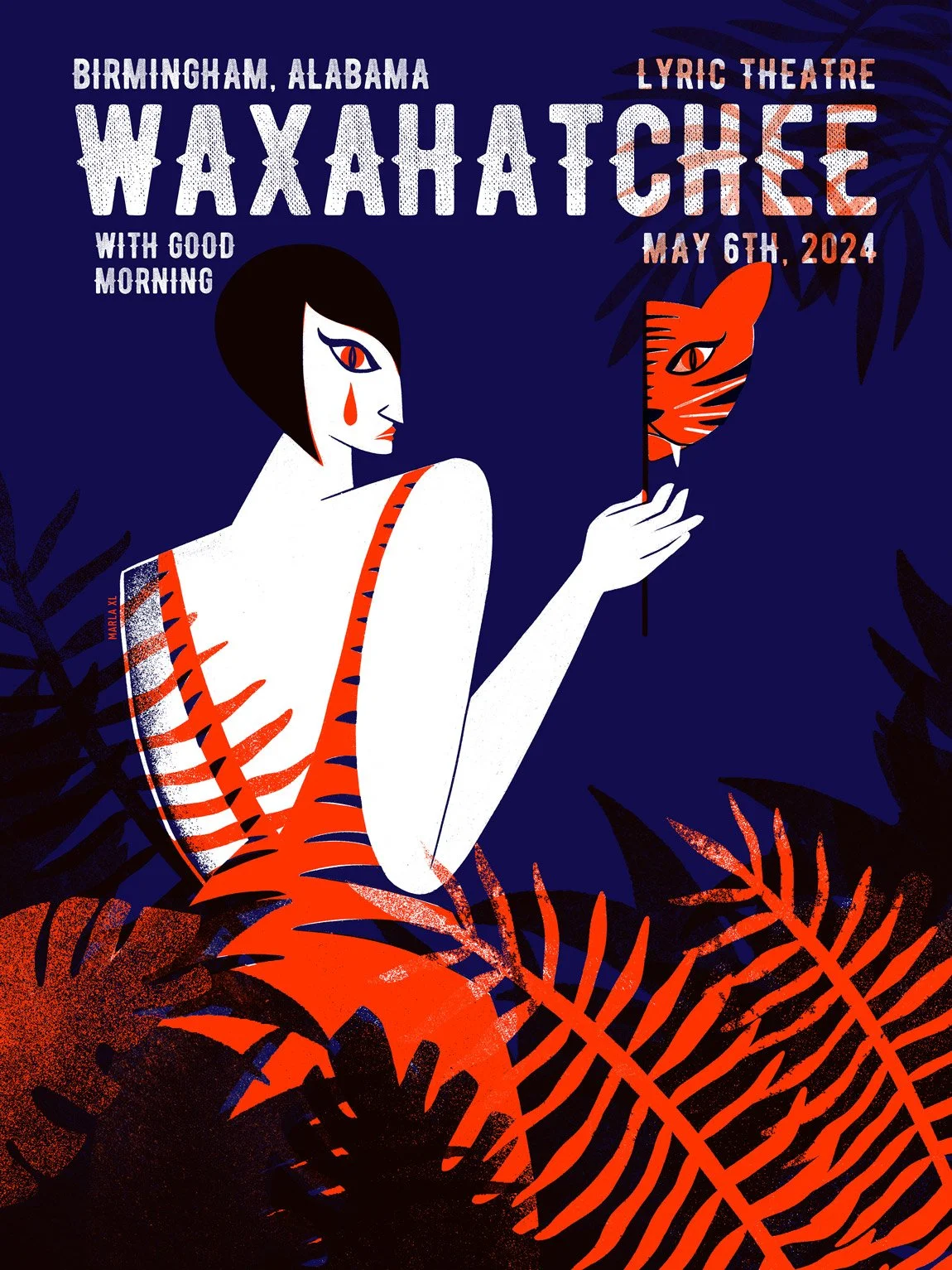 This poster was created for Waxahatchee’s 2024 US tour, designed to support the announcement of her new album Tigers Blood. The artwork draws from the album’s emotional tone and visual universe, blending bold color, theatrical symbolism and a sense of intimate drama.