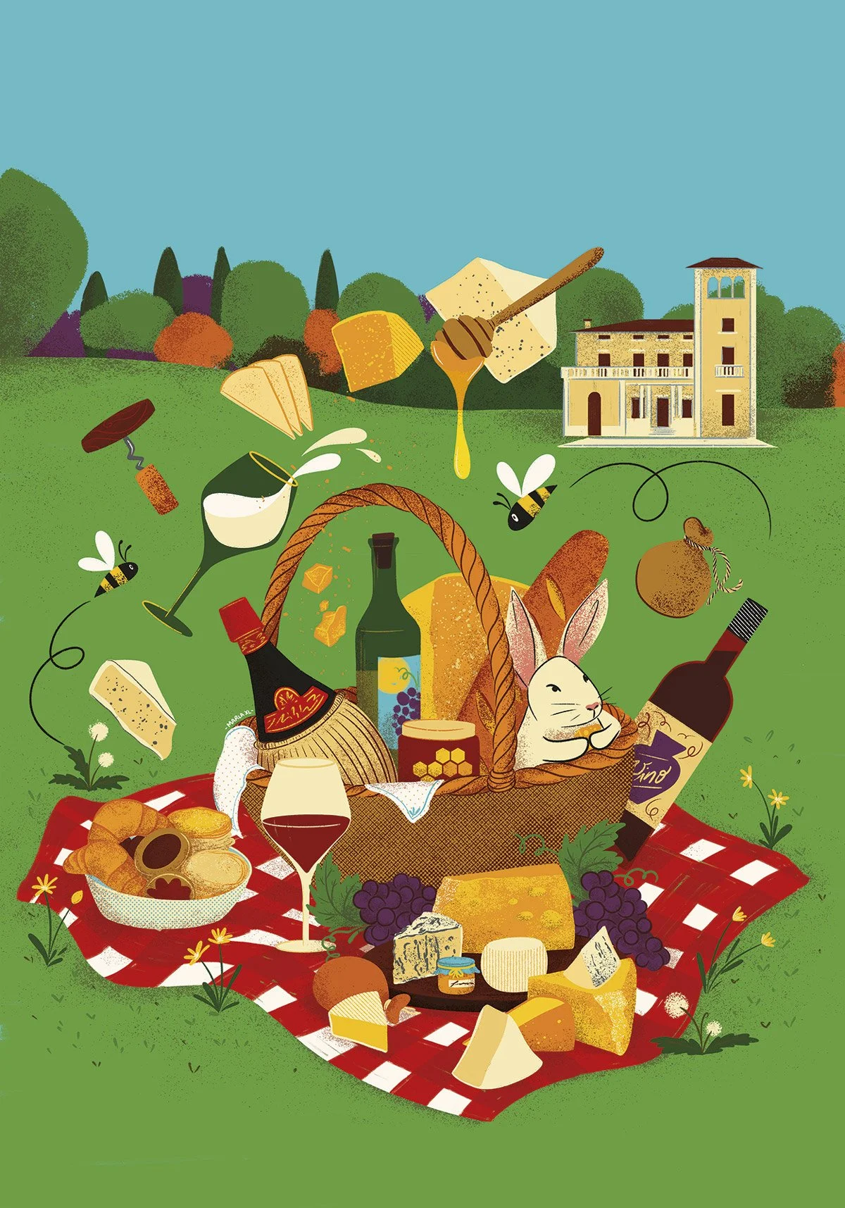This illustration was created for Di… Vin Formaggio, the annual food and cheese festival in Collecchio, Italy. The artwork celebrates the richness of local gastronomy through a playful countryside picnic scene filled with regional products, seasonal colors and a warm, inviting atmosphere.